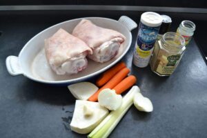 Alle Zutaten bereitstellen, die Haxen waschen und mit einem scharfen Messer die Haut rautenförmig einritzen