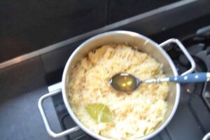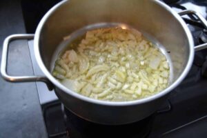 Etwas Butterschmalz erhitzen und die Zwiebelwürfel kurz andünsten