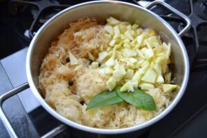 das Sauerkraut, die Apfelwürfel, Wacholderbeeren, Salz und die Lorbeerblätter zum Kraut geben