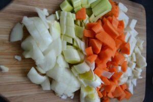 Möhren, Zwiebel, Knoblauch und Sellerie schälen und klein würfeln. Das Lauch waschen und klein schneiden