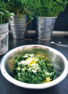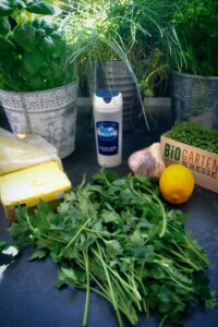 Alle Zutaten bereitstellen, die Butter solltest du 10-15 min vor der Zubereitung aus dem Kühlschrank nehmen. So kannst du sie besser verarbeiten. Die Kräuter waschen und dann sehr fein klein schneiden. Die Zitrone waschen und etwas von der Schale abreiben