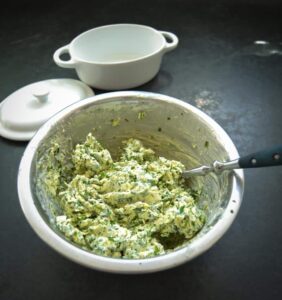 und dann mit dem Messerrücken etwas zerdrücken. Alles mit der weichen Butter gut vermischen. mit Salz und geriebener Zitronenschale würzen und abschmecken.