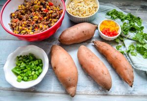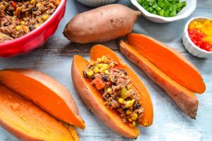 Du kannst das Chili con Carne schon einen Tag vorher zubereiten oder Du bereitest die Füllung in der Zwischenzeit zu, wenn die Süßkartoffeln kochen.