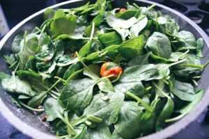 Den Spinat in die Pfanne geben und etwas zusammen fallen lassen und