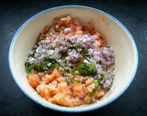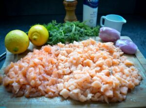 Den leicht angetauten rohen Lachs und geräucherten Lachs in kleine Würfel schneiden. Ich nehme gern gefroren Lachs, da er dann wirklich ganz frisch ist und lasse ihn nur etwas antauen. So leicht angetaut, kann man ihn sehr gut in kleine Würfel schneiden.