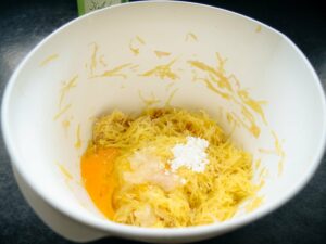 Die Kartoffeln schälen und grob raspeln, falls sie Kartoffelwasser absetzen, dies mit einem Löffel entfernen. Mit Salz und Pfeffer würzen und die Speisestärke unterrühren. Ihr könnt die Rösti mit und ohne Ei machen, meistens mache ich den Teig ohne Ei.