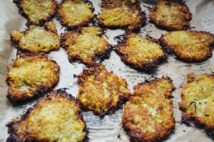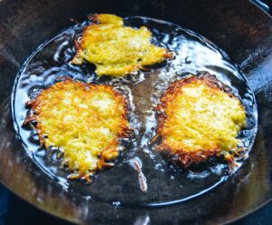 Das Rapsöl erhitzen und aus dem Kartoffelteig kleine Puffer backen