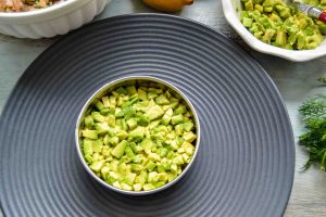 Das ca. 3 Esslöffel Tatar in das Förmchen gegen, darauf die Avocado Würfel setzen und mit einer Schicht Lachs-Tatar abschließen.