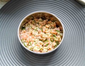 Das Lachstatar auf einem Teller anrichten. Besonders schön sieht es aus, wenn du es in einem Förmchen zu einem kleinen Turm formst.