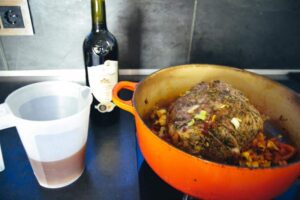 Mit etwas Lammfond und dem Rotwein ablöschen. Die Lammkeule im vorgeheiztem Ofen bei 170-175 Grad Umluft ca. 90-100 min garen. Ich verwende gern ein Bratthermometer, um gern mein Bratthermometer um die Kerntemperatur der Keule besser festzustellen. Mit dem Rotwein und dem Lammfond zwischendurch angießen