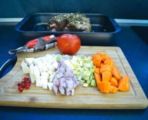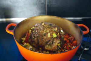 Etwas Olivenöl in einem Bräter erhitzen und die Lammkeule von allen Seiten kurz anbraten. Die Gemüsewürfel zum Lamm geben und alles kurz mit anrösten