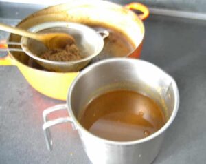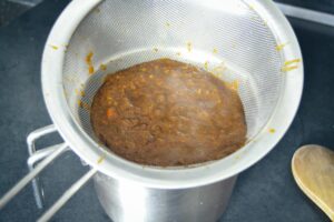 durch ein Sieb passieren, die festen Gemüsestückchen mit einem Löffel durch das Sieb drücken.