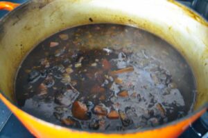 nach 60 Min. die Lammkeule aus dem Sud nehmen, in eine Auflaufschale legen und zurück in den Ofen schieben.