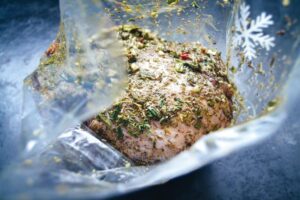 Etwas Olivenöl in einen Gefrierbeutel geben und die Lammkeule mit dem Knoblauch, Lorbeerblättern in den Beutel geben. Die Lammkeule über Nacht marinieren und kühl stellen