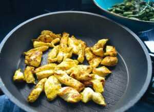 Etwas Olivenöl in die Pfanne geben und die Hähnchenbrust Stücke je nach Größe 8-10 Minuten braten.