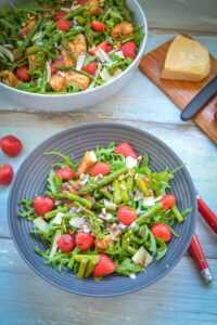 Lauwarm, super lecker und schnell zubereitet, grüner Spargelsalat mit Erdbeeren, etwas Parmesan, Rucola und Hähnchenbrust. Dieser frühlingshafte Salat kann als Hauptgericht oder als Vorspeise gegessen werden.
