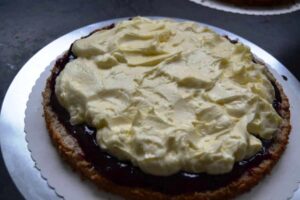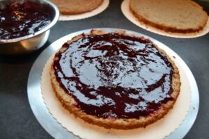 Biskuitboden mit selbst gekochen Waldfrucht Aronia Konfitüre bestreichen und dann mit einigen Esslöffel