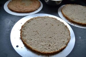 Am nächsten Tag den Buchweizen Biskuit in drei Böden schneiden