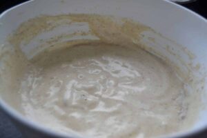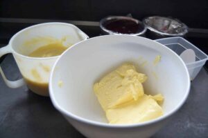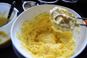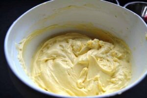 nun die Vanillecreme löffelweise zur Butter geben und rühren . Wichtig ist das die Butter und der Pudding die gleiche Temperatur haben.