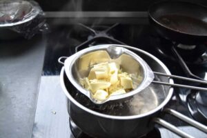Butter und Vanille Pudding und Kuvertüre verrühren