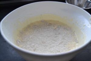 das gesiebte Buchweizen Mehl , Speisestärke und Backpulver vermischen und zur Ei Masse geben