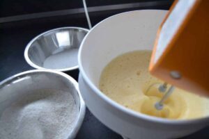 Eier und Zucker sehr schaumig aufschlagen bis sich die Masse verdoppelt hat