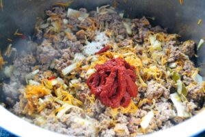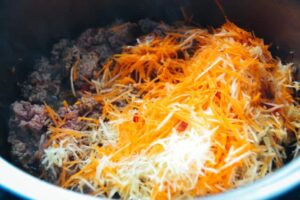 die geraspelten Möhren und Sellerie mit den Lorbeerblättern mit dem Hackfleisch braten, bis alles Farbe bekommen hat
