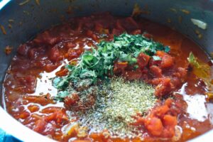 den Oregano zufügen und alles auf kleiner Flamme 45-60 Minuten köcheln lassen.