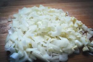 die geschälte Gemüsezwiebel und Chileschote klein würfeln