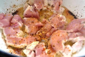 In einem Wok oder großem Topf das Sesamöl erhitzen, die gewürzte Hähnchenbrust Stücke von allen Seiten anbraten