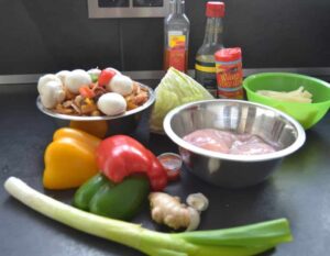 Das Hähnchenfilet, Paprika, Ingwer, Pilze, Lauchzwiebel, Knoblauch und Ingwer in Stücke schneiden.