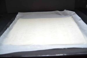den Blätterteig ausrollen und mit Backpapier auf ein Backblech legen