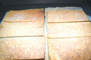 den Teig bei 200 Grad ca. 15 Minuten im vorgeheizten Ofen backen. Dann das Backpapier oder die Folie entfernen. Leicht mit Puderzucker bestäuben und noch ca. 4-5 Minuten backen, damit die Oberfläche etwas karamellisiert. Die Platte abkühlen lassen