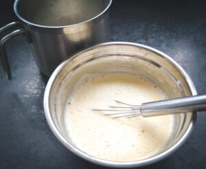 Die Eier trennen und das Eiweiß für ein anderes Gebäck z.b. Baise verwenden. Die Milch erhitzen, aber nicht sollte nicht kochen.