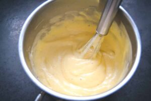 Nach und nach die warme Milch unter die Ei-Stärke gießen und gut verrühren. Dann die Eigelb-Milch auf dem Herd aufkochen lassen. Dabei gut rühren, damit sie nicht ansetzt.
