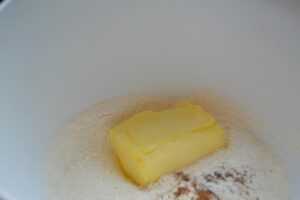 und mit dem Backpulver, Vanillezucker, Lebkuchen Gewürz und der Hefe mischen. Die weiche Butter unterrühren