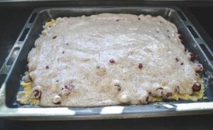 Die Mohncreme über die Kirschen gießen