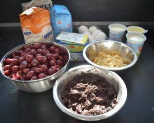 Alle Zutaten abwiegen und bereitstellen, die Kirschen in einem Sieb gut abtropfen lassen
