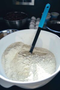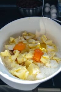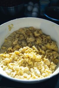 mit dem Mehlgemisch, zwei Eier, den Butterwürfeln