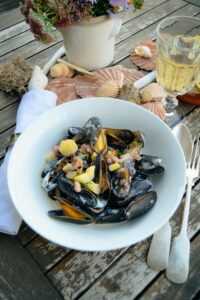 Schnelles Muschel Rezept, leckere Muscheln kochen auf normannische Art mit Äpfeln, Bacon, Cidre in einer cremigen Crème fraîche Soße. Die besten Miesmuscheln habe ich in der Normandie in der Region Calvados gegessen.