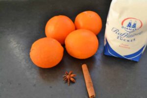 Die Orangen waschen und in 2 Orangen Scheiben schneiden die restlichen schälen möglichst dünn und die Schale mit möglichst wenig weißer Haut in dünne Streifen schneiden. Die Orangenstücke für den Kompott werden aus der Haut später geschnitten