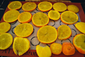 Die im Sirup gekochten Orangenscheiben und Schalen im vorgeheizten Backofen bei 80 Grad ca. 1 Stunde trocknen