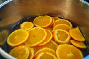 Orangenscheiben kochen in Zuckerwasser ca. 5-6 Minuten