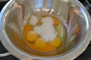 das Eigelb mit dem Ei und dem Zucker in einer Metallschüssel über einem heißem Wasserbad