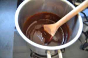 Nougat, Schokolade und die Kuvertüre in der Sahne schmelzen. Die Sahne soll nicht kochen