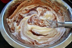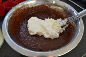 Nougat, Schokolade Masse vorsichtig mit der Ei Zuckermischung verrühren. Die steif geschlagene Sahne unter