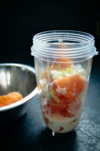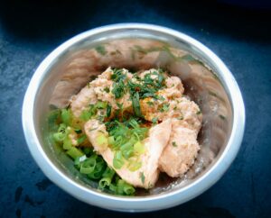 Den gefrorenen Lachs in grobe Würfel schneiden. Die Lauchzwiebeln waschen und den weißen Teil kleinschneiden. Die Lachswürfel mit ca. 30-40 ml Sahne und dem weißen Teil der Lauchzwiebel
