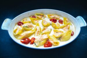 Den Lachs für 3-4 Stunden einfrieren, damit die Farce später nicht zu weich ist. Die Muschelnudeln in Salzwasser ca. 10 Minuten kochen, sie sollten nicht weich gekocht werden! Da sie später im Ofen noch nach garen. Die Nudeln nach dem Kochen abtropfen und abkühlen lassen.