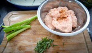 Die Estragon Blätter vom Stiel streifen und ca. 2/3 mit dem grünen Lauch der Zwiebel klein schneiden. Die Lachs-Farce mit dem Piment de Espelette und ca. knapp 1/2 TL Meersalz würzen.