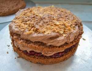 Die leckere Nuss Nougat Torte mit Buttercreme wirst du lieben. Die Torte wird mit einer leckeren cremigen Schoko-Nougat-Buttercreme, einem fluffigen Nussbiskuit und Preiselbeeren und Giotto Pralinen zubereitet.